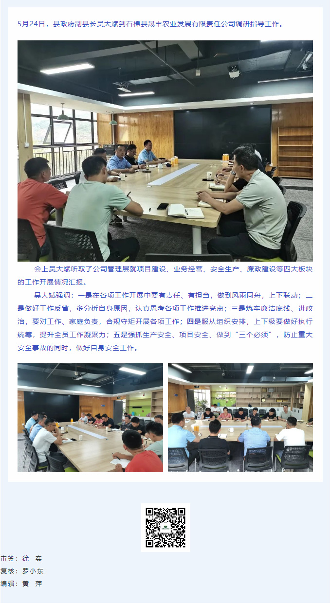 縣政府副縣長吳大斌到石棉縣晟豐農業發展有限責任公司調研指導工作